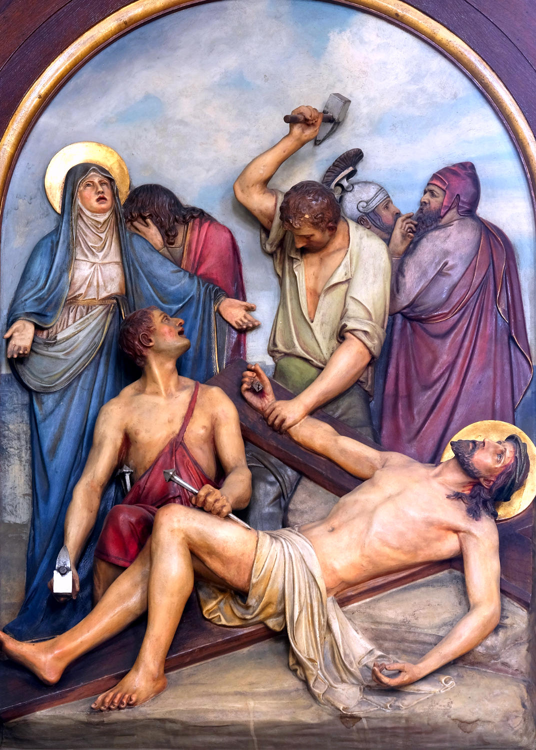 യേശു്, എന്റെ മധുരമായ ജീവൻ! ക്രൂസിഫിക്ക്ഷനിന്റെ വെല്ലുവിളി തന്നെ തുടങ്ങിയിരിക്കുന്നു. നീയുടെ വലത് കൈയ്ക്കുള്ള ശിക്ഷകന്മാരുടെ പ്രവർത്തനം അവസാനിപ്പിച്ചതിനു ശേഷം, അപരിമിതമായ ക്രൂറതയോടെയാണ് അവർ നിന്റെ ഇടത്തേ കൈ പിടിക്കുകയും അതെല്ലാം വരുന്ന നെയില് ഹോൾവിലേക്ക് വലിച്ചു കൊണ്ടുപോകുന്നു. നീയുടെ കൈകളും മണ്ഡലങ്ങളും തങ്ങളുടെ ജോഡികളിൽ നിന്ന് വിട്ടു പോയി, വെല്ലുവിളിയുടെ ഫലമായി പാദങ്ങൾക്കുമുള്ള ചുരുങ്ങൽ ഉണ്ടാകുകയും ചെയ്യുന്നു. അവർ നിന്റെ വലത് കൈയ്ക്ക്റെ ക്രൂരതയിൽ നിന്നും ഒന്നിനോടൊന്ന് നീയുടെ ഇടത്തേ കൈയെയും നഖം ചെയ്തു കൊണ്ടിരിക്കുന്നു.