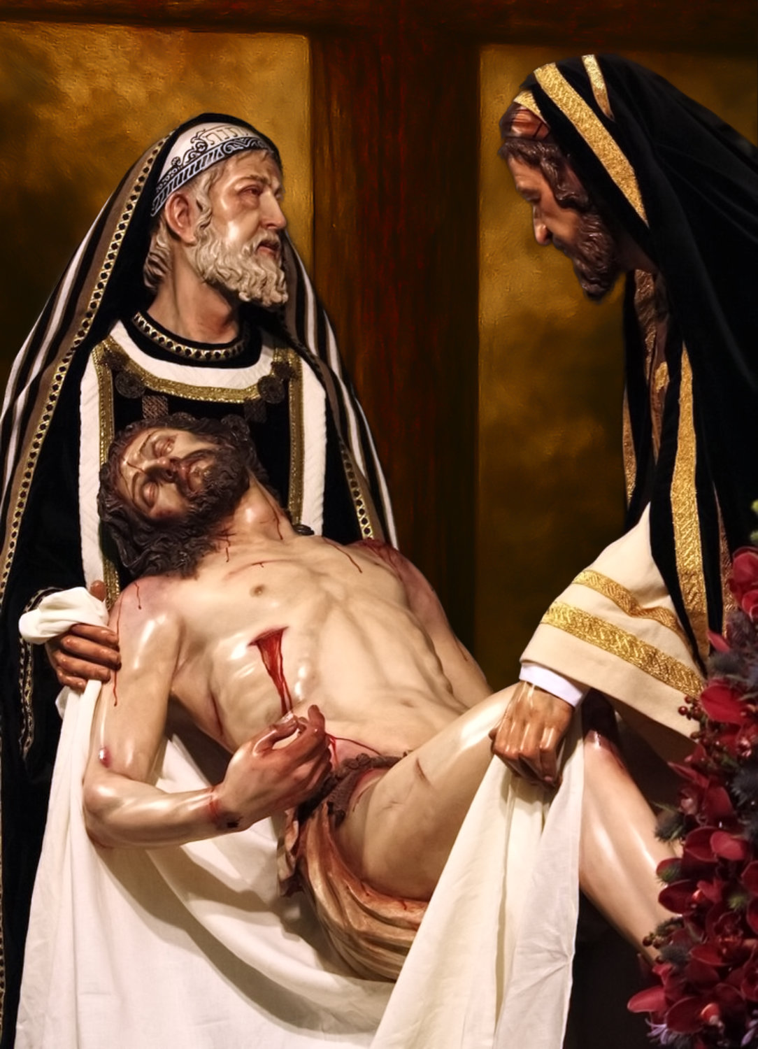 മരണത്തിൽ മരിച്ച ജീസസ്! ശിഷ്യന്മാർ നിനക്ക് ക്രൂഷിലനിന്ന് ഇറങ്ങാൻ വേഗം ചെയ്യുന്നതിനെ ഞാനു കാണുന്നു. അറിയാമേയാ, യോസഫ് ആരംതിയയും നിക്കൊഡിമുസും മുമ്പിൽ ഒളിച്ചിരുന്നവരാണ്, അവർക്ക് ഇപ്പോൾ നിനക്കുള്ള ഒരു ബഹുമാന്യമായ സംസ്‌കാരം നൽകാൻ തീര്‍ച്ചയായിരിക്കുന്നു. ഭയം കൂടാതെ സാഹസികതയും കൊണ്ട് അവർ ക്രൂഷിലനിന്നും നിനക്കു മോചനം നേടാനായി ചാക്കുവും കൈവരവും എടുക്കുന്നു, അതേ സമയം നിന്റെ അമ്മ പീഡയാൽ തുരുമ്പിച്ച ഹൃദയത്തോടെ നിങ്ങളുടെ ശരീരം സ്വീകരിക്കാൻ വിരലുകൾ വിടർത്തിയിരിക്കുന്നു.
