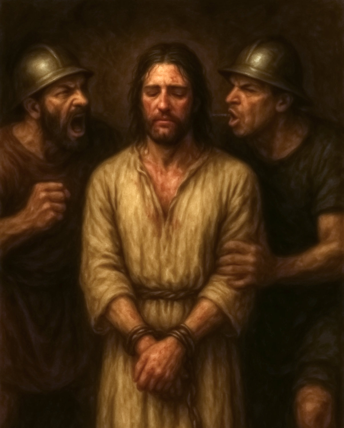 യേശു, എന്റെ പ്രേമം! നിങ്ങളുടെ ദുഃഖത്തോടെ കാണുമ്പോൾ എന്റെ ഹൃദയം നില്ക്കാൻ ആഗ്രഹിക്കുന്നു. ന്യൂനംപെടുകയും കണ്ണുകൾ മൂടി നിങ്ങൾക്ക് ഇങ്ങനെ പീഡിതരായിരിക്കേണ്ടതില്ല എന്നു തോന്നുന്നു. എന്നാൽ നിങ്ങള് എന്റെ ശ്രദ്ധയിലേക്കും പ്രണയം എന്റെ കണ്ണുകളിൽ നിങ്ങളുടെ ദൃശ്യത്തെ പിടിച്ചുനിർത്താൻ ബലപ്പെടുത്തുന്നു. യേശു, നിനക്ക് എന്താണ് സംഭവിക്കുന്നത്? നീ ഒരു വാക്കുമില്ലാതെയുള്ളതായി നില്ക്കുന്നുണ്ട്. ഈ സൈനികരുടെയും അവരുടെ അസംസ്കൃതമായ തീരുമാനങ്ങളുടേയും കയ്യില് നിങ്ങള് ഉണ്ട്, അവർക്ക് നിനക്കെന്തു ചെയ്യാൻ ഇഷ്ടമാണോ ആണ്. അവർ നീയെ ഭൂമിയിലേയ്ക്ക് വലിച്ചിടുകയും ദൈവികമായ രോഗത്തോടെയുള്ള കാലുകളാൽ തടിക്കുകയും ചെയ്യുന്നു, അത് എന്റെ മതിയിൽ നിന്നും നിങ്ങളുടെ പാദങ്ങളിൽ നിന്ന് മരണം ഉണ്ടാകുമോ എന്നു ഭയപ്പെടുന്നുണ്ട്.