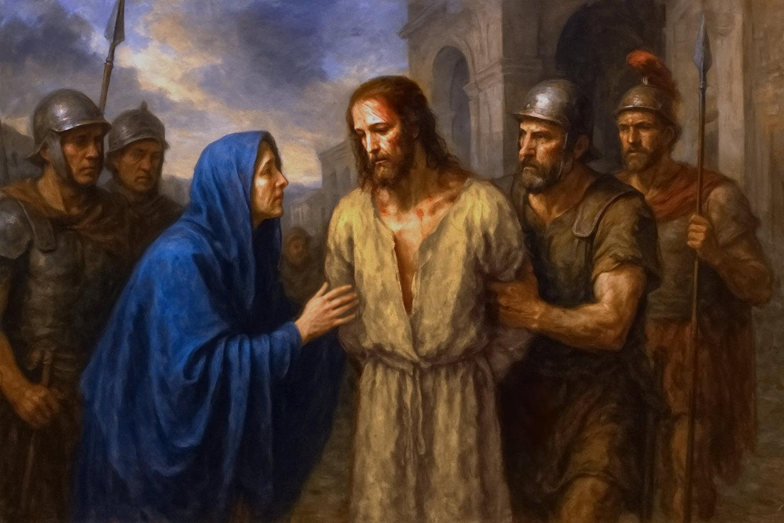 Nikifuatawe, ninakutaona wewe, jua langu, kuungana na jua lingine katika hatua ya kwanza ya ndani ya nyumba ya Caiaphas: Maria, Mama yetu mpenzi. Macho yenu yanakuja pamoja, kukutana kwa ajili ya majeraha yao. Kwa sababu hata ikiwa ni faraja kuwona wengine, myoyoni mengi zimechomwa na maumivu. Ni maumivu gani kwako kukuona mama yangu mwema anayepooza na kumaliza kwa dhiki! Ni maumivu gani kwa Mama yako kukuta wewe, jua la milele, umefifia na madhambi mengi, machozi na damu! Lakini si kwa muda mrefu mtaweza kujiendelea kufurahia faraja ya kuchukulia macho pamoja, kwani hawana neno moja kuwasiliana katika dhiki kubwa, lakini myoyoni mengi yote yanashirikishwa na kukutana. Askari wanakusubiri mbele, ewe Yesu yangu. Wakikamata na kukupeleka zaidi ya kujaribu, unakuja kwa mahakama ya Roma.