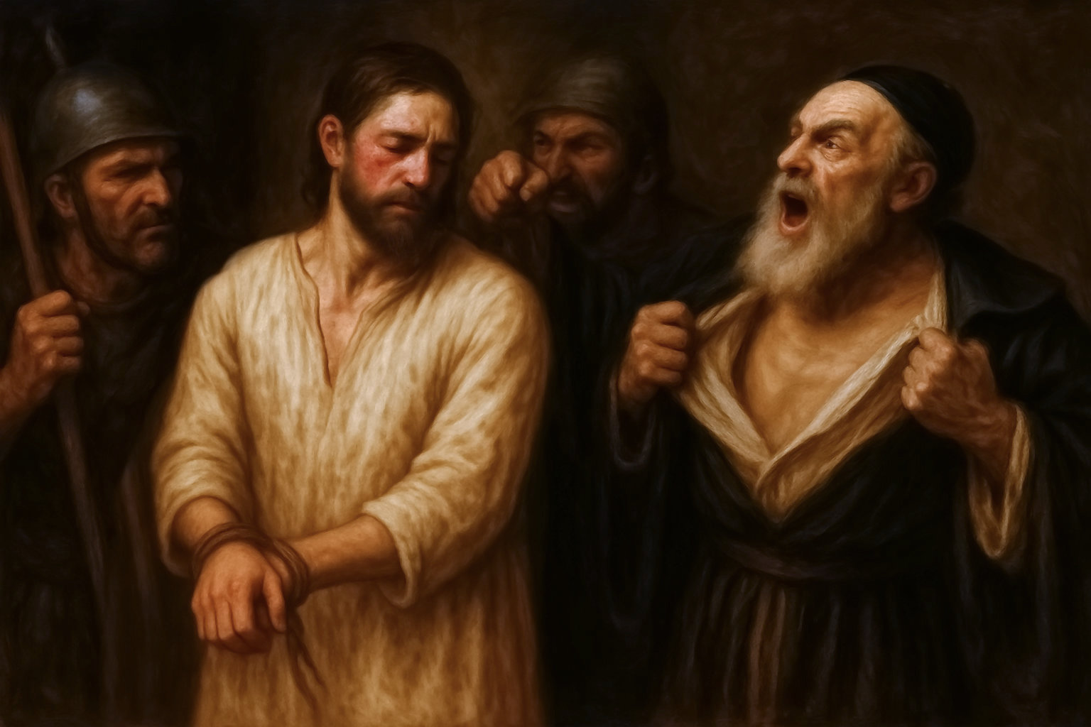 இயேசு காயபாஸிடம் கொண்டுவரப்பட்டதால், அவர் குற்றவாளியாகக் கருதப்படுகிறான் மற்றும் முன்னெப்போதும் இல்லாத அவமானங்களுக்கு உட்படுத்தப்படுகின்றான். வினாவல்களில், அவர் எப்பொழுதுமே சத்தியத்தைச் சொன்னார்.